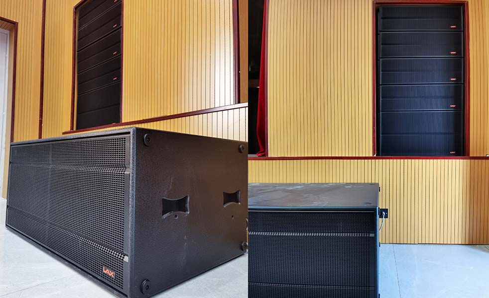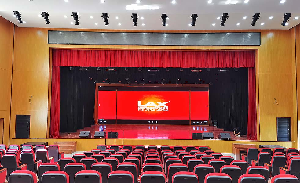 主擴(kuò)聲選擇了LAX AT系列線陣音響,全頻4只+次低音1只+超低音1只組合,為了達(dá)到裝飾上的美觀以及設(shè)計(jì)上的聲學(xué)要求,選擇了隱藏式安裝在舞臺(tái)左右兩側(cè),使聽(tīng)眾區(qū)的邊角、后區(qū)都能擁有足夠的清晰度和聲場(chǎng)均勻度。