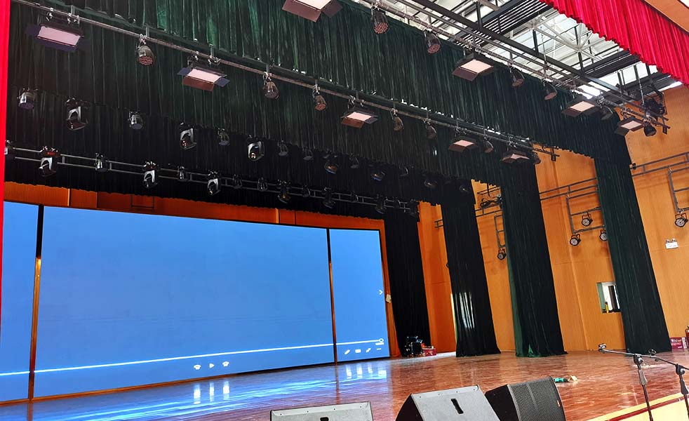 舞臺(tái)幕布由一道對(duì)開(kāi)大幕、一道對(duì)開(kāi)二幕組、一道對(duì)開(kāi)底幕組成,達(dá)到裝飾舞臺(tái),提高演出效果的作用。