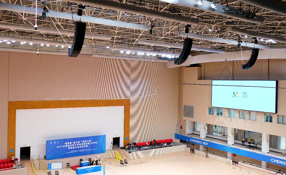 西華大學(xué)體育館為成都大運(yùn)會(huì)排球項(xiàng)目比賽、熱身場(chǎng)館。技術(shù)工程團(tuán)隊(duì)使用了30只LAX TOP線性陣列系列揚(yáng)聲器,為觀眾區(qū)域提供清晰的擴(kuò)聲傳達(dá)。比賽區(qū)域使用10只3D束波揚(yáng)聲器LAX PS12系列。在這些揚(yáng)聲器的協(xié)助下,保證了聲音的清晰度、傳輸?shù)姆€(wěn)定性以及音效的直達(dá)聲效果,為觀眾們提供更加有氛圍感的觀看體驗(yàn),讓我們的比賽更加引人入勝。