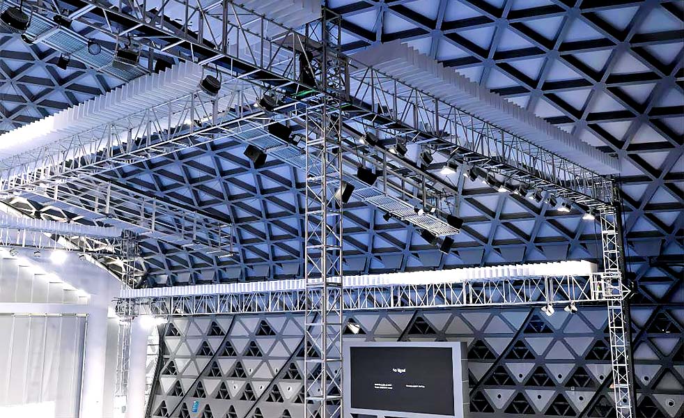 主席臺(tái)左右兩側(cè)配置LAX線性陣列揚(yáng)聲器TOP110,每組6只,共四組;主席臺(tái)側(cè)觀眾區(qū)配置每組8只,共3組.揚(yáng)聲器指向角度為水平(H)100°?垂直方向(V)10°,均勻覆蓋觀眾區(qū),保證了現(xiàn)場(chǎng)良好的聽感效果。LAX TOP110每只揚(yáng)聲器的重量不超過(guò)25公斤,每組采用雙吊點(diǎn)吊裝,觀眾區(qū)域揚(yáng)聲器總吊裝質(zhì)量不超過(guò)350公斤。