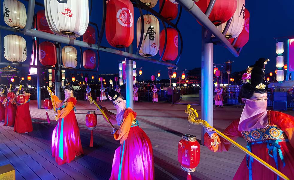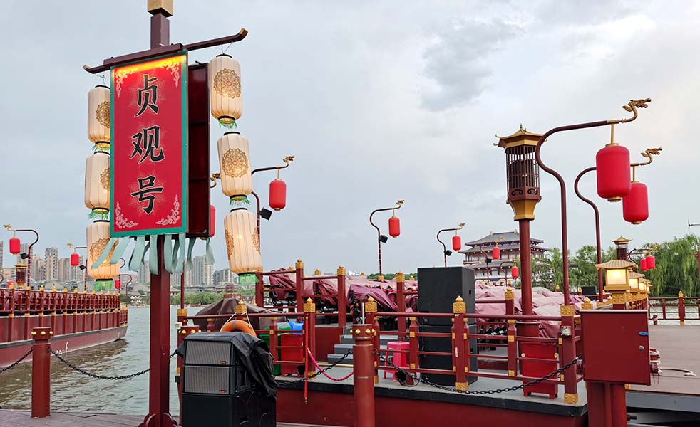 占地面積1000畝,其中水域面積300畝。大唐芙蓉園共有十四個景觀文化區(qū),集中展示了唐王朝一柱擎天、輝耀四方的精神風(fēng)貌、璀璨多姿、無以倫比的文化藝術(shù),以及它橫貫中天、睥睨一切的雄渾大氣。