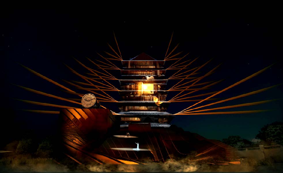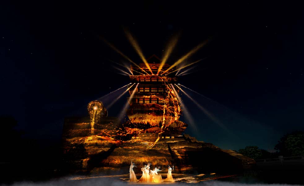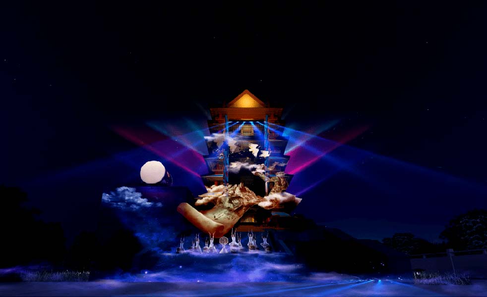 《大有蘭州》整個光影秀包含 10 分鐘純燈光秀,40 分鐘光影演藝,還有一個散布在樓體周邊廣場的互動光影夜游體驗?!洞笥刑m州》光影秀利用 30 多臺大功率激光投影機(jī)及最新的投影播控技術(shù),用影像覆蓋整個黃河樓東面塔樓及東廣場臺階平臺部分,結(jié)合激光、燈光、霧機(jī)等舞臺效果,通過演員的互動表演及舞蹈演藝,營造震撼的演藝光影秀。整體塔樓安裝了 250 多臺明道最新的戶外防水電腦燈和 10 臺激光燈,立體多緯度地將黃河樓點亮,通過創(chuàng)意光影秀為黃河樓增添活力。