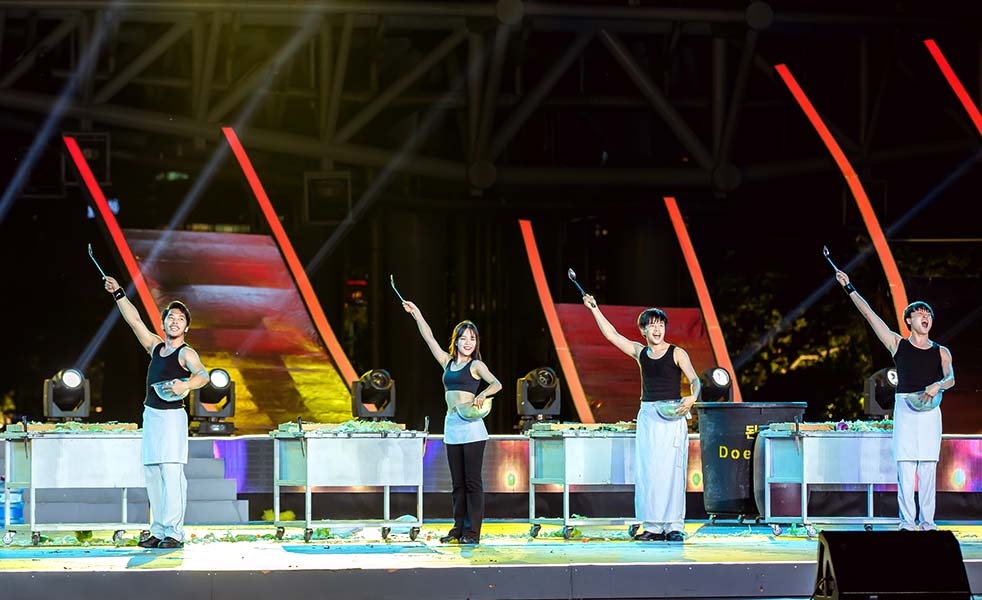 展演以極具視覺沖擊效果的開場(chǎng)燈光音樂(lè)秀開場(chǎng)。以夜色為幕,通過(guò)科技燈光、數(shù)控激光,聯(lián)動(dòng)8塊LED帆屏,璀璨奪目的燈光效果,配合多維度擴(kuò)聲的音樂(lè),一下子便驚艷了現(xiàn)場(chǎng)觀眾。燈光秀以水為核心意象,以美食為媒,從粵港澳大灣區(qū)美食和文化、中華美食和文明、亞洲美食及文明三個(gè)維度,呈現(xiàn)了“和合亞洲,味聚廣州”的主題內(nèi)涵,一幅關(guān)于嶺南文化和亞洲國(guó)家文明的畫卷悠然展開。