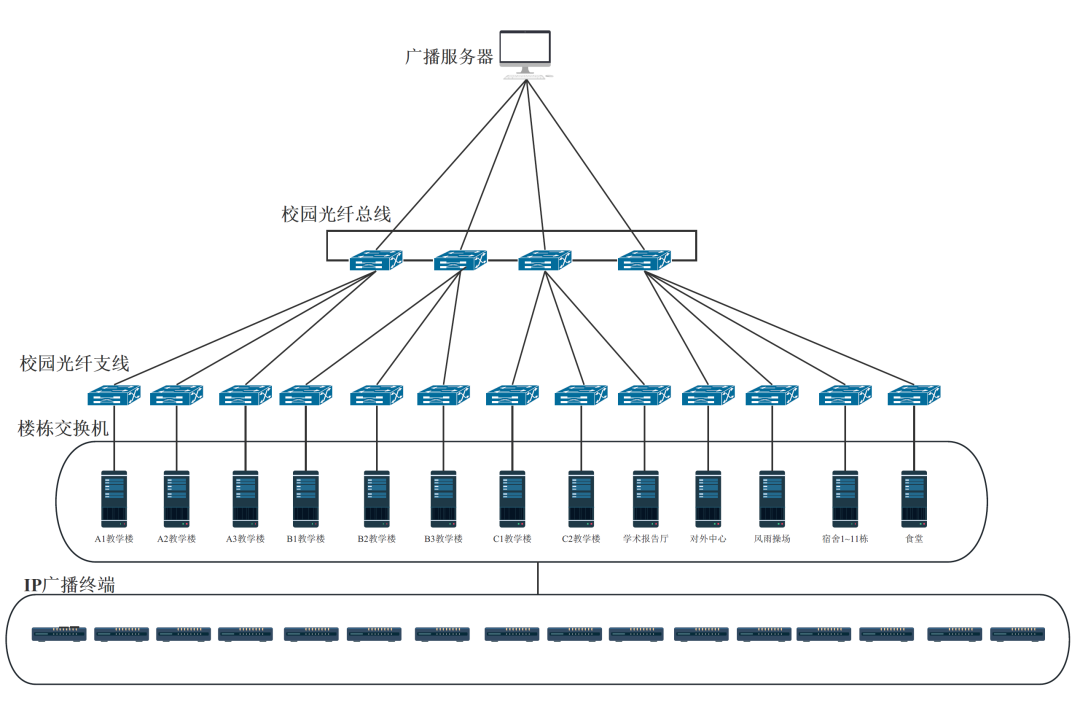 通過學(xué)校預(yù)埋光纖,每棟建筑的廣播網(wǎng)絡(luò)匯聚至行政綜合樓6樓。每棟建筑一樓使用2路光纖(一主一備),配置光口交換機(jī),樓層網(wǎng)口較多的在樓層3樓做分層交換機(jī),每間課室及實(shí)訓(xùn)室獨(dú)立布網(wǎng)線至樓層弱電間,實(shí)現(xiàn)獨(dú)立的廣播網(wǎng)絡(luò)局域網(wǎng)。