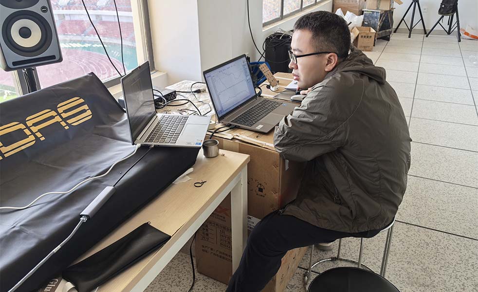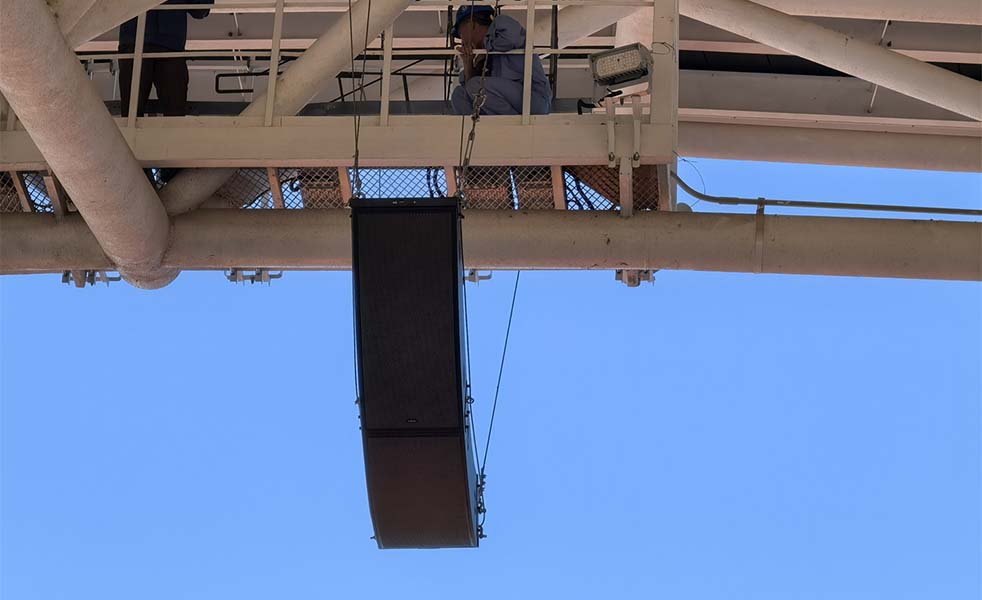 LAX總工程師趙春寧在恩賈梅納體育場實地勘測,調(diào)整揚聲器的中高頻指向性,通過波長陣列揚聲器在體育場館的應(yīng)用,確保聲音在場館能夠更加清晰穩(wěn)定和均勻覆蓋全場。