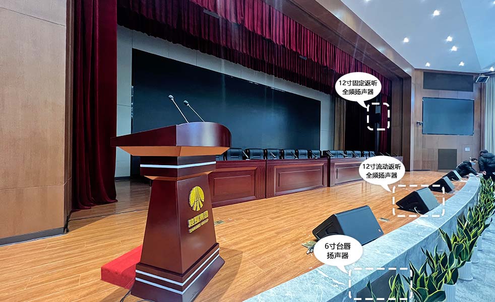 拉聲像音響選用2只12寸全頻音響,采用左右均勻布置的隱藏安裝,起到承上啟下的作用,覆蓋臺(tái)唇和主擴(kuò)聲音箱之間的銜接,解決前場(chǎng)觀眾因舞臺(tái)兩側(cè)音箱覆蓋角角度指向不夠所需的一種補(bǔ)充及對(duì)聲像的修正。