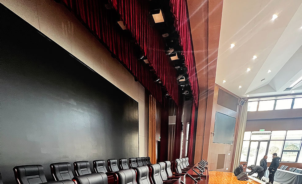 我司為本項(xiàng)目舞臺(tái)機(jī)械幕布系統(tǒng)配備:1道前檐幕、1道對(duì)開(kāi)大幕、3道燈光吊桿、1道固定面光、2道橫側(cè)幕吊桿、1道景物吊桿、1道對(duì)開(kāi)底幕,臺(tái)上電氣與控制系統(tǒng)。