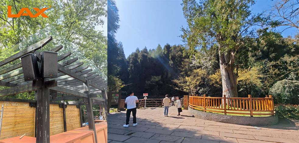 在百年古樹(shù)旁邊一個(gè)廊亭上,桿頂掛采用兩只TR110定制版全天候防水全頻揚(yáng)聲器,音源跟隨投影畫(huà)面同步控制。