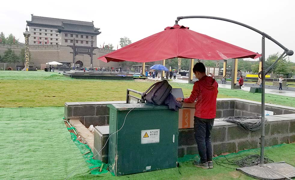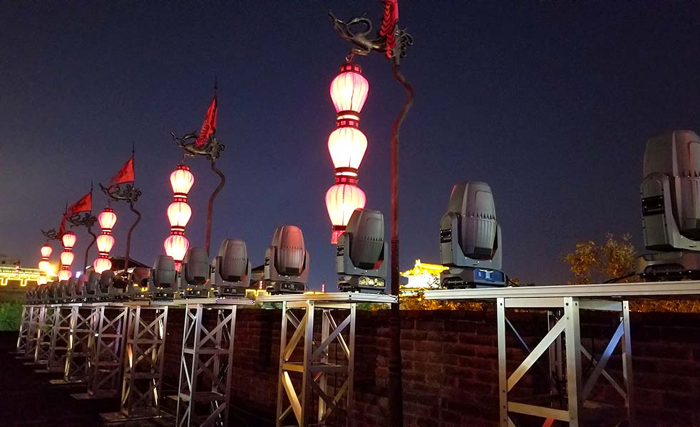 西南城角“嗨皮·陜博”光影秀,LAX AF110-P線陣列音箱搭配LAX AFL18B-P超低揚聲器使用,數(shù)字音頻處理器是DSP36而功放機產(chǎn)品是MT1300。PS108全天候全頻音箱作為返聽揚聲器,使用的是MPA4-500功放。