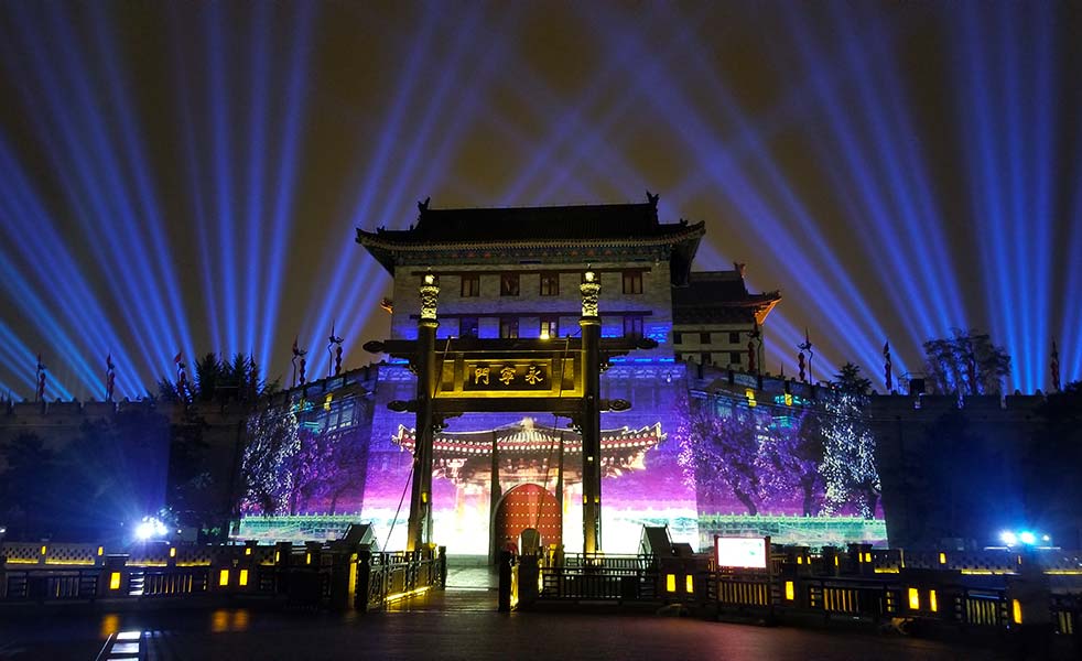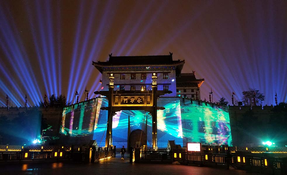 2018年國慶期間,西安永安門城墻用一場大型城墻光影秀《長安頌》,和全國人民一起慶賀祖國69歲生日。《長安頌》是國賓級禮儀文化演出《夢長安》的姊妹篇,依托西安的城市發(fā)展文化背景,分別展示:長安城初建、十三王朝的更迭與變遷、盛世大唐的文化魅力與舞姿唐詩的風采、絲綢之路的文明交匯、現(xiàn)代西安的城市新面貌以及西安不斷開拓進取,不忘初心的科技發(fā)展。此次演出由LAX音響相助,全方位展現(xiàn)西安十三朝古都、三千年文化積淀的人文歷史景觀,帶領觀眾穿過千年之門,認識西安、了解西安,體驗西安城市魅力。