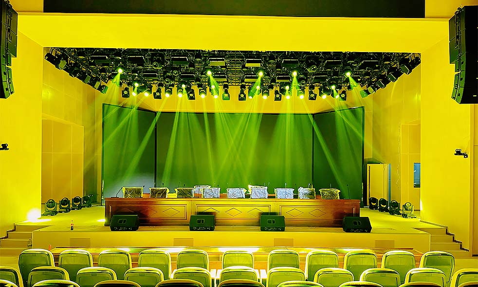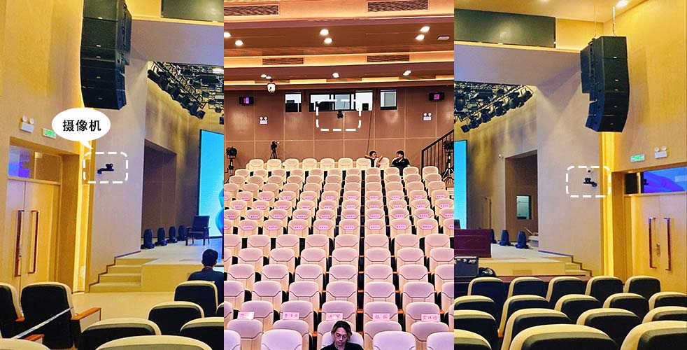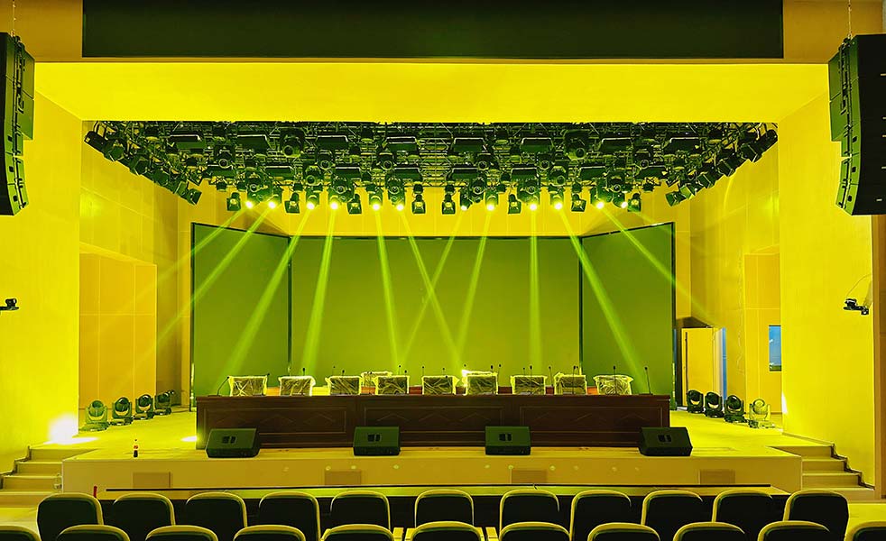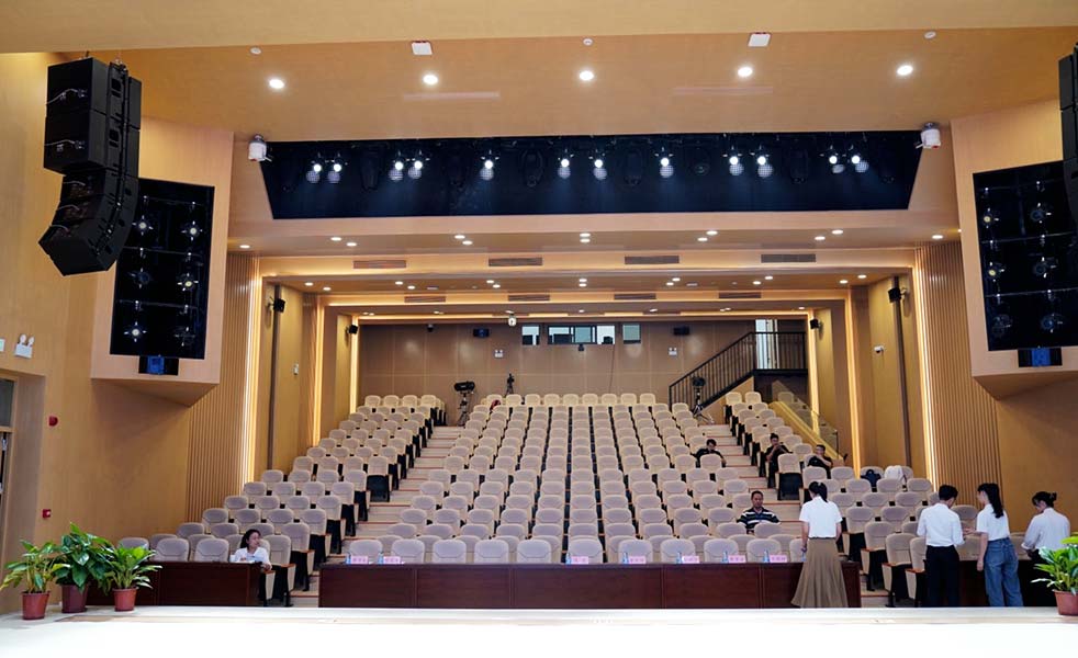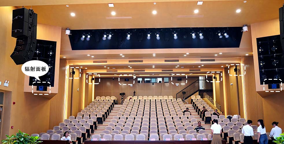 報(bào)告廳主擴(kuò)聲揚(yáng)聲器選用兩組12寸線陣音響組,每組由3只12寸全頻音響+2只18寸超低揚(yáng)聲器組成,吊掛安裝在舞臺(tái)左右兩側(cè),實(shí)現(xiàn)觀眾區(qū)的均勻聲場覆蓋。