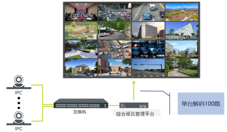 系統(tǒng)另外支持接入綜合視訊管理平臺,該平臺支持GB28181,ONVIF協(xié)議,單臺設(shè)備支持100路IPC攝像頭信號同時(shí)上屏。