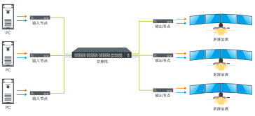系統(tǒng)內(nèi)各個(gè)終端之間采用各類分布式收發(fā)終端連接各個(gè)信號源和顯示設(shè)備,終端可通過網(wǎng)線或光纖連接到交換機(jī),無需中心服務(wù)器,即可實(shí)現(xiàn)系統(tǒng)快速搭建和運(yùn)行,任意單節(jié)點(diǎn)的終端設(shè)備故障,均不影響系統(tǒng)其他節(jié)點(diǎn)設(shè)備的繼續(xù)正常運(yùn)行。