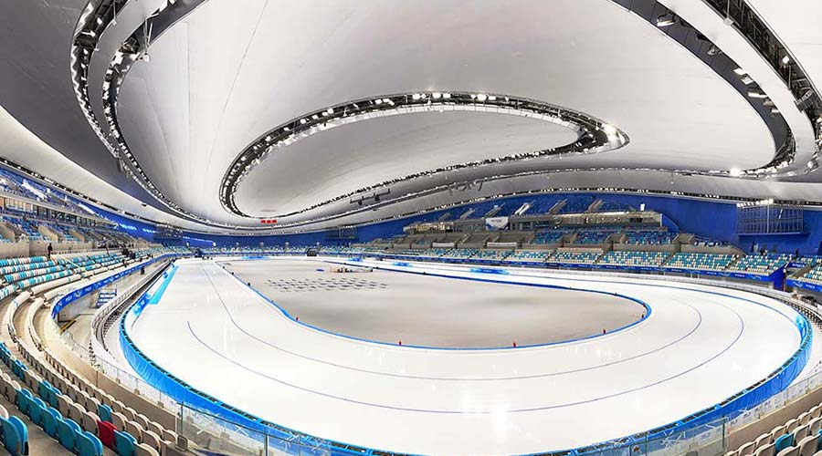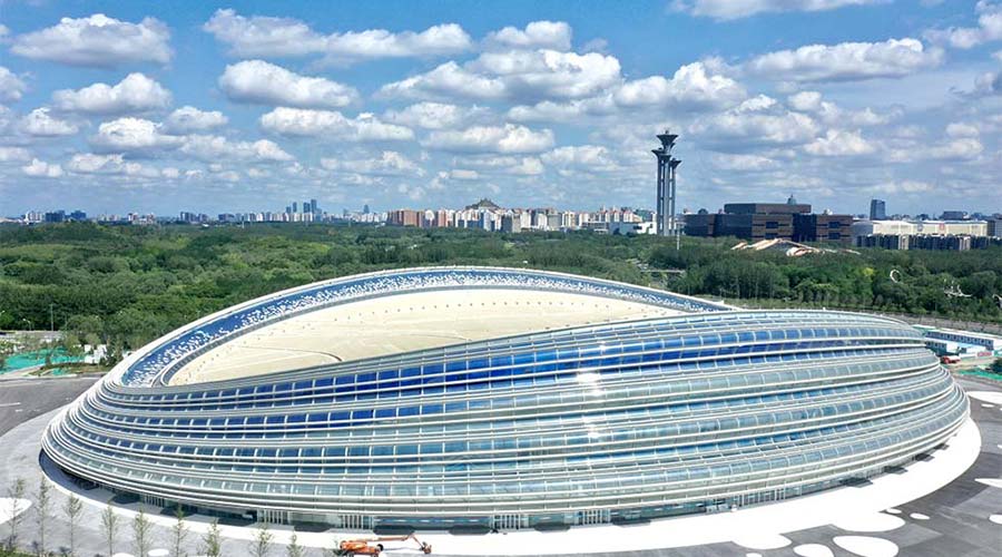 國(guó)家速滑館是北京2022年冬奧會(huì)北京主賽區(qū)標(biāo)志性場(chǎng)館、唯一新建的冰上競(jìng)賽場(chǎng)館。它的設(shè)計(jì)理念來(lái)自一個(gè)冰和速度結(jié)合的創(chuàng)意,22條晶瑩美麗的“絲帶”狀曲面玻璃幕墻就像運(yùn)動(dòng)員滑過(guò)的痕跡,象征速度和激情,因此又被稱為“冰絲帶”。2022年北京冬奧會(huì)期間它將承辦速度滑冰比賽。