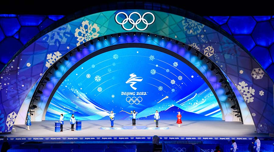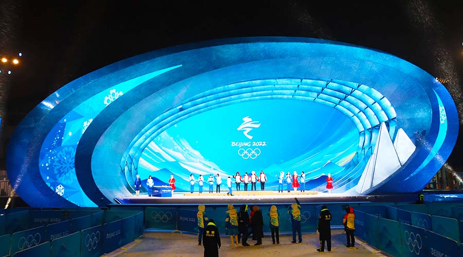 北京頒獎(jiǎng)廣場(chǎng)舞臺(tái)名為“美美與共”,位于北京城區(qū)的國(guó)家體育場(chǎng)和國(guó)家游泳中心之間,飽含喜迎八方客、共度中國(guó)年的良好寓意。