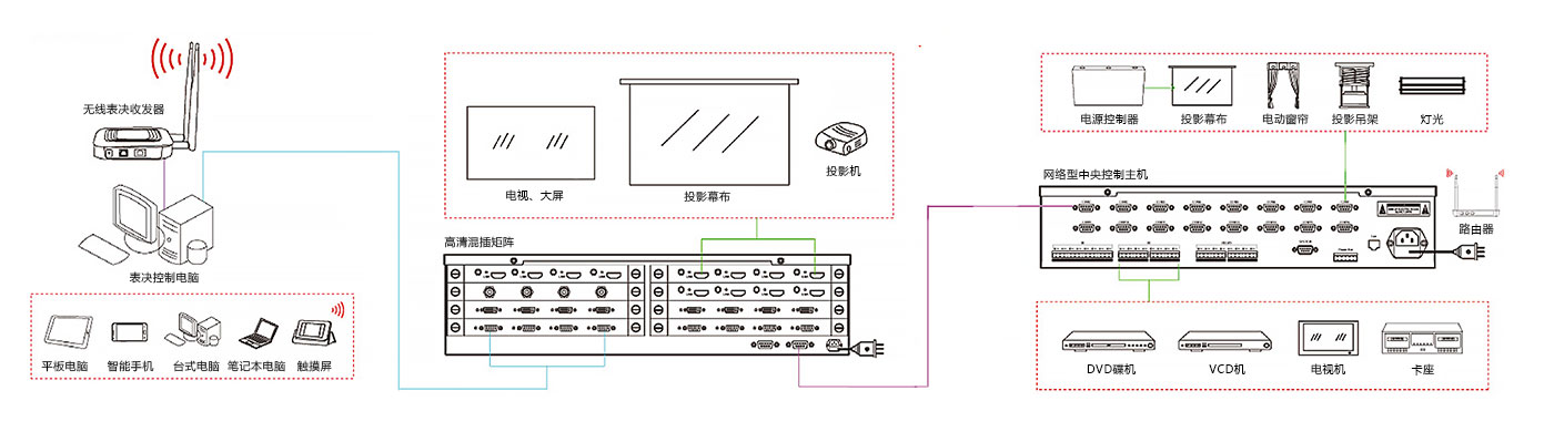 音視頻切換模塊、VGA電腦信號切換模塊、紅外學(xué)習(xí)及發(fā)射模塊、設(shè)備電源管理模塊、電動屏幕控制模塊、音色音量處理模塊、控制接口處理模塊、電源模塊、網(wǎng)絡(luò)模塊等構(gòu)成。